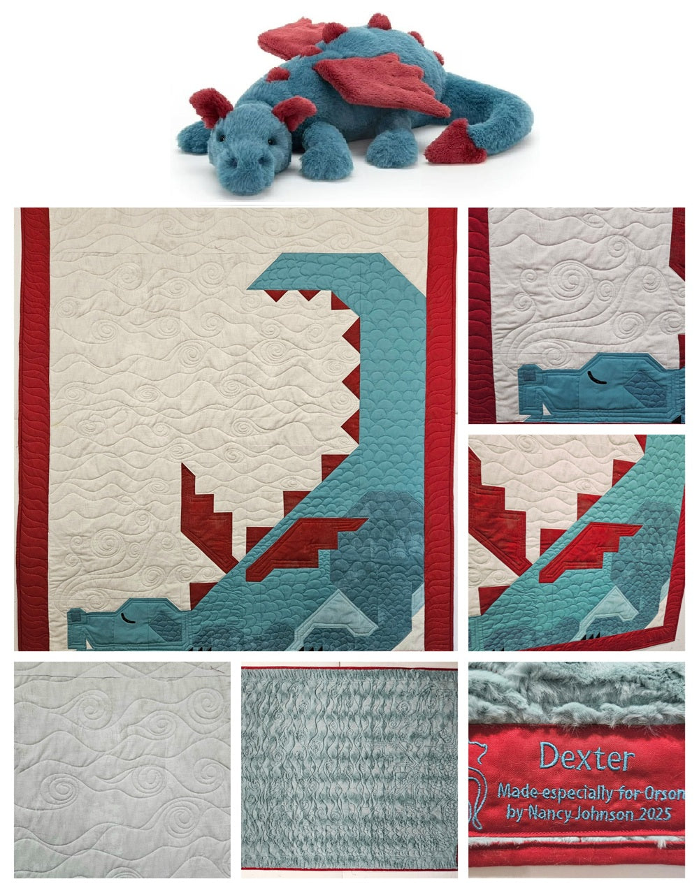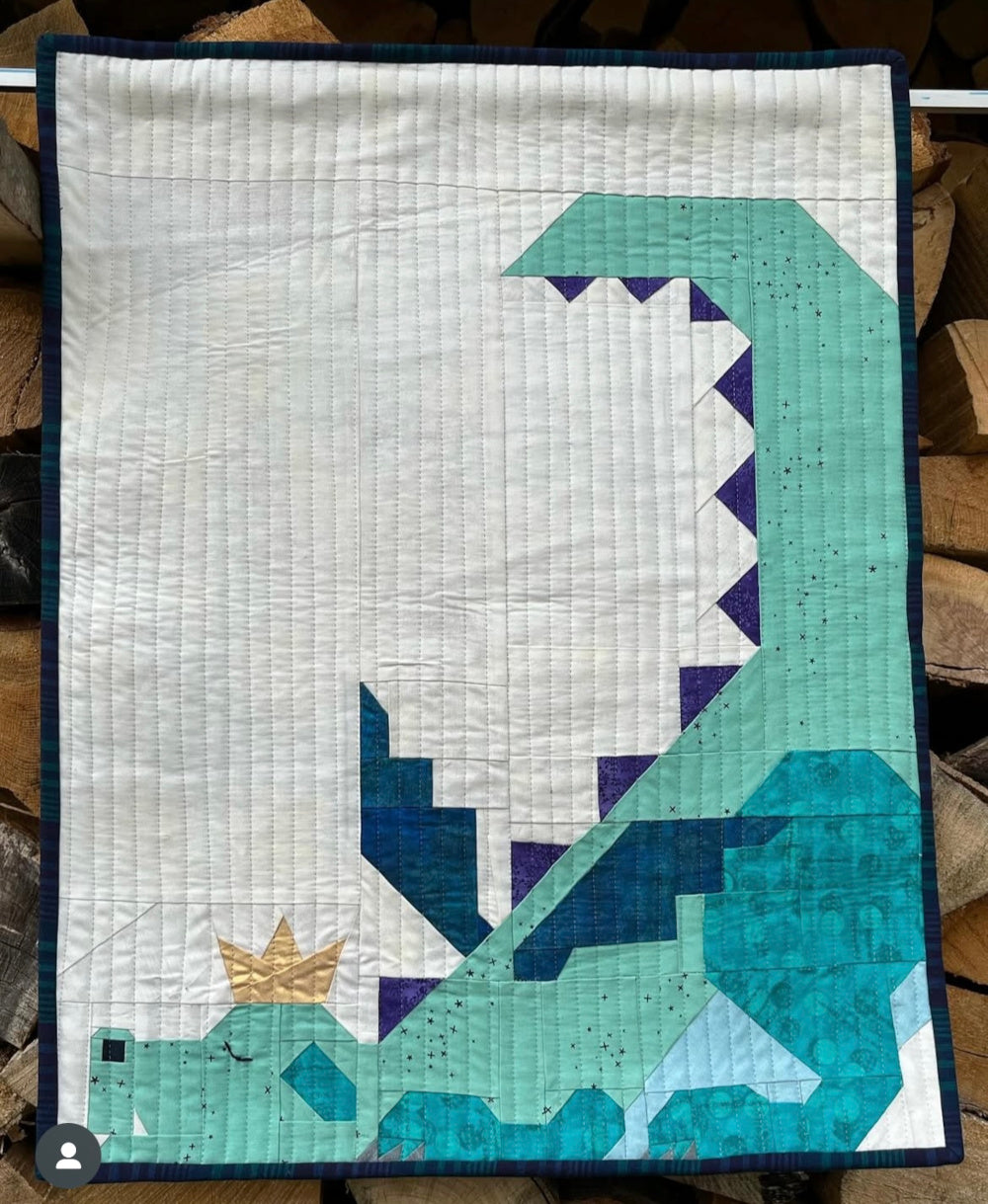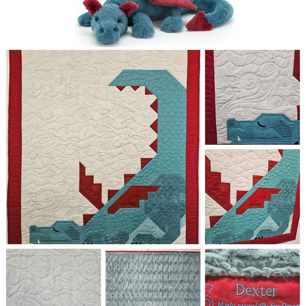 “I've always wanted to make the dragon quilt. One day when I was once again looking at a picture of the pattern I sent it to my son who lives in Chicago and I told him I really wanted to make this one day. Their reply was a picture of a stuffed dragon that was toted around by a lovely 3-year-old who is a close family friend. They said “this is Dexter. He has been this little guy’s favorite toy since birth.” So that was all the inspiration I needed to