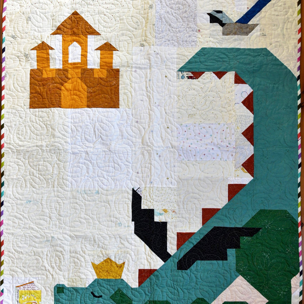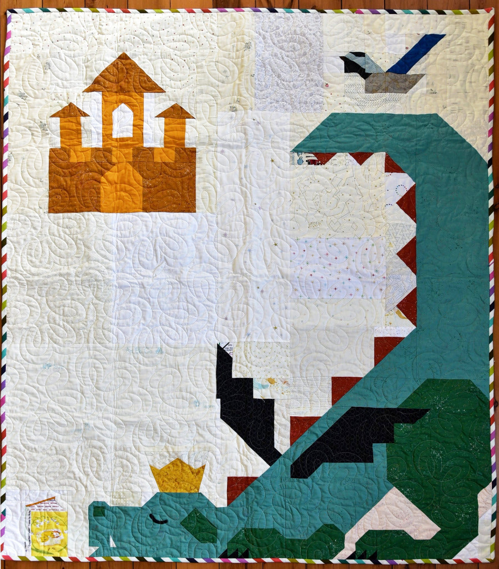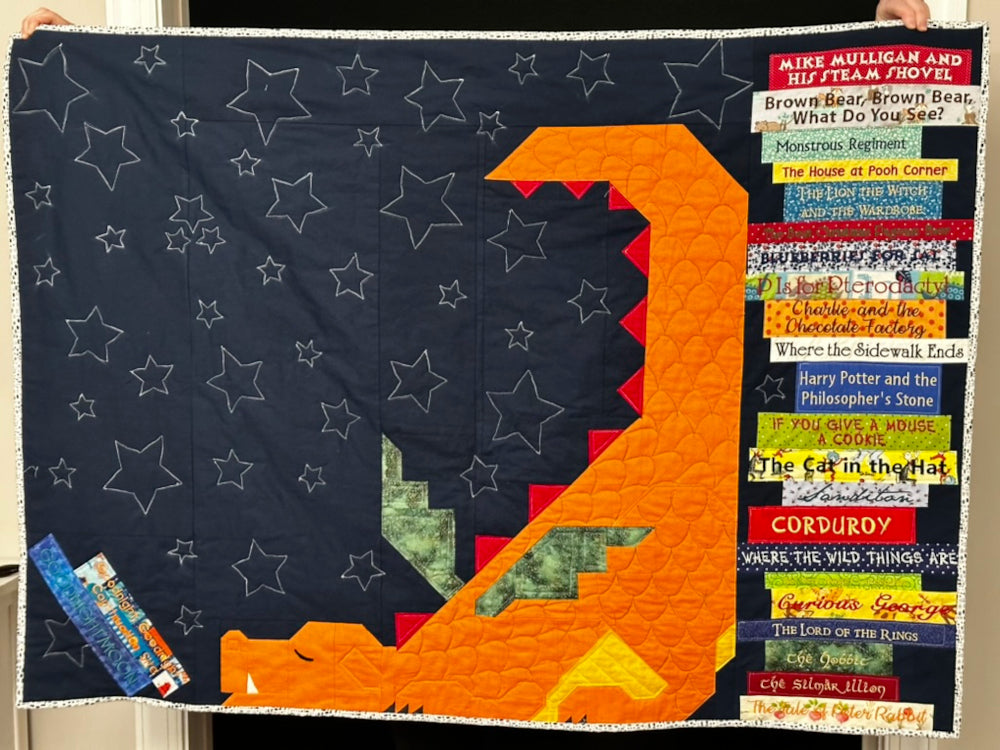 "I'd been wanting to make the dragon quilt for a while. I resized it slightly, and then embroidered children's book titles on blocks to make the books. I think it's my favorite quilt that I've ever made. Thanks for the pattern!"