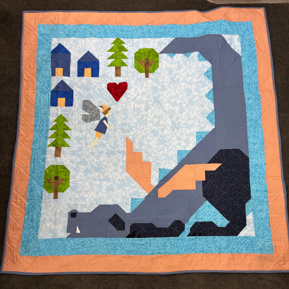 “This quilt was made for my great niece who was born at 29 weeks gestation. The FPP fairies represent her (Audrey) and her big brother (Eoin). The dragon represents her feistiness! Audrey is a thriving 15 month old today! 🥰”