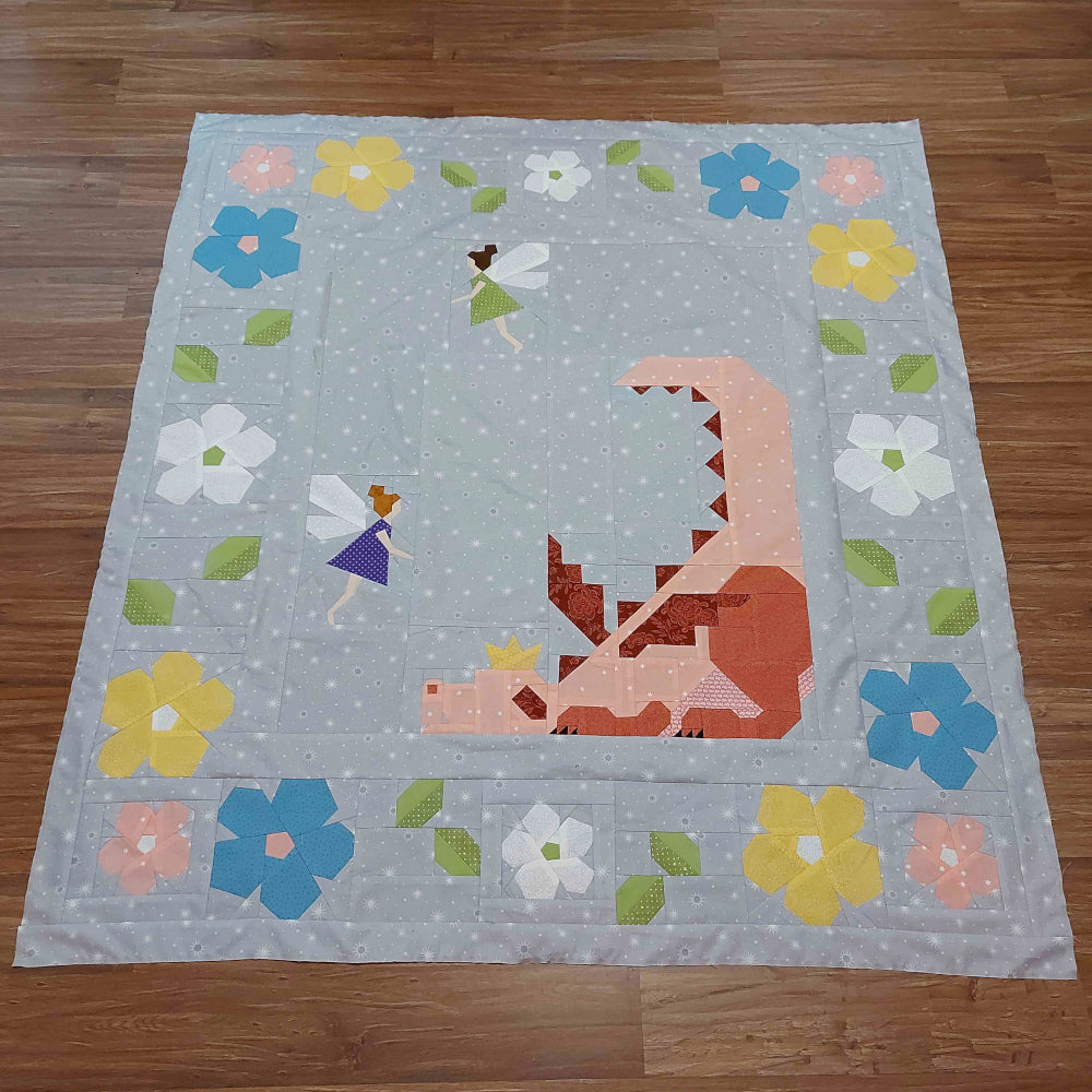 “I made this Dragon Dreams quilt for my first grandchild. I began sewing in early March 2024 and finished the top just before Felicity was born in August 2024. As soon as I saw Dragon Dreams, I knew it was the perfect design for my new granddaughter’s quilt. My daughter and her partner are both avid gamers and my daughter has been playing DnD since she was a teenager. I added the Princess story book - a pattern by Kate Basti - as a nod to my new little “Princess Granddaughter”. The Fairy Wren is a nod to her Australian roots and I drafted the pattern myself. Every Dragon needs a castle in the sky to dream about and this one was inspired by a FQS pillow pattern that I redrafted to fit in the sky area. I used a variety of low volume fabrics from my stash for the background fabrics. There are even some fabrics that represent the UK, including London Underground fabric showing the towns in London my daughter has lived in. Felicity was actually born 6 weeks early, so, as I made a frantic flight from Australia to the UK, one of my lovely friends bound and labelled the quilt when it came back from the long arm quilter. It was brought over by my husband when he came over a few weeks afterwards."