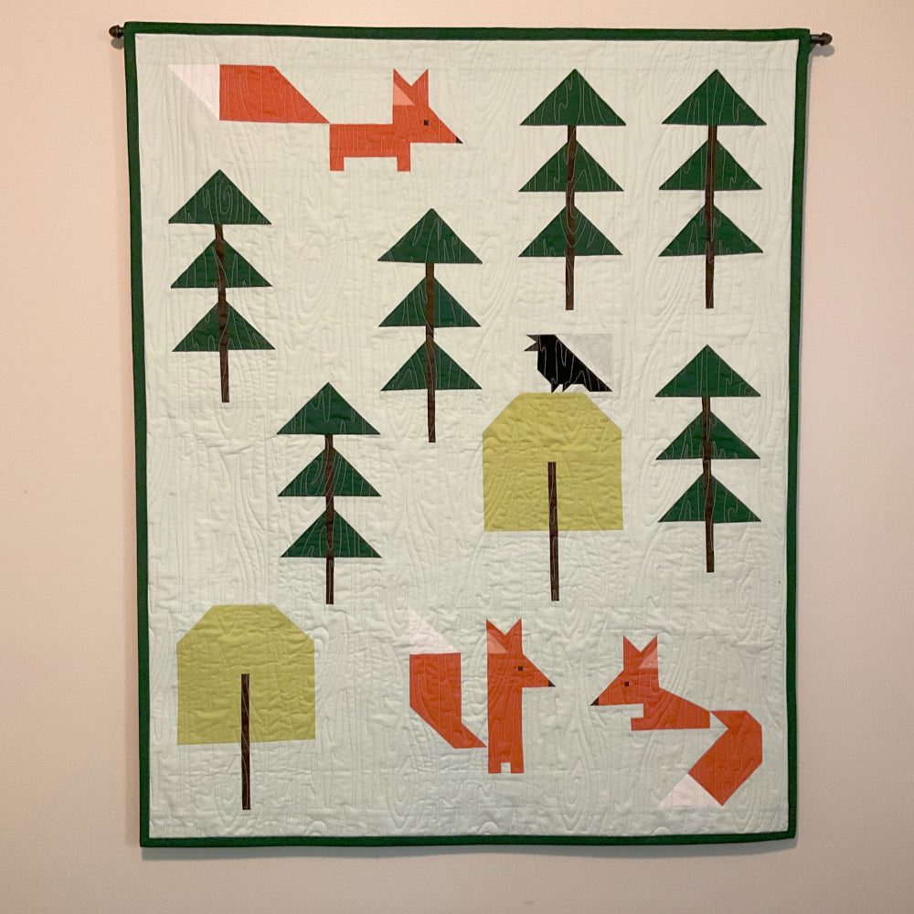 “I made this wall hanging as a memory quilt. One summer, a pair of foxes and 3 kits denned on the corner of ours and our neighbour’s properties, and spent their days wandering all over our properties, playing, eating strawberries, catching mice, and annoying the dogs. Our gentle giant, Ben, was perplexed by their behaviour, couldn’t get the kits to stay off the property, and ended up not eating or sleeping. Finally, our neighbours took off to their cabin with their dogs, and we loaded up Ben in our vehicle and went to visit friends, driving for 4 hours for a few days respite. Ben got his appetite back and slept for 3 days to recover. By the time we got home, the fox family was gone! When I saw the fox tale pattern with 3 foxes I just had to make this. We also had a crow hanging around that summer as well, so I added a crow too.""