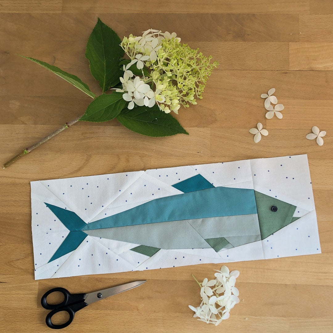 Ready for a bunch of happy Sardines? This quilted wall hanging makes a great statement in the home of any fish enthusiast! And it is such a fun project: five foundation paper pieced fish blocks, finished off with a tiny button eye as fun and whimsical detail.