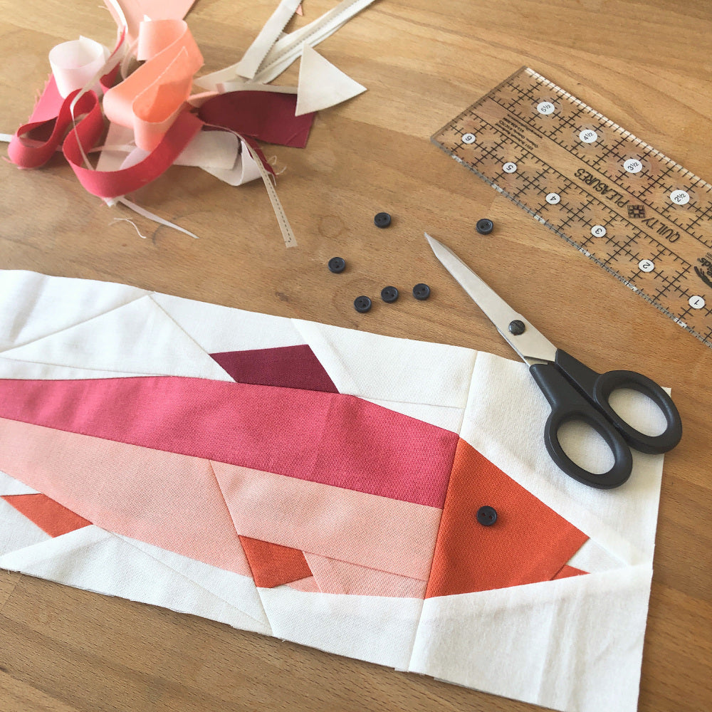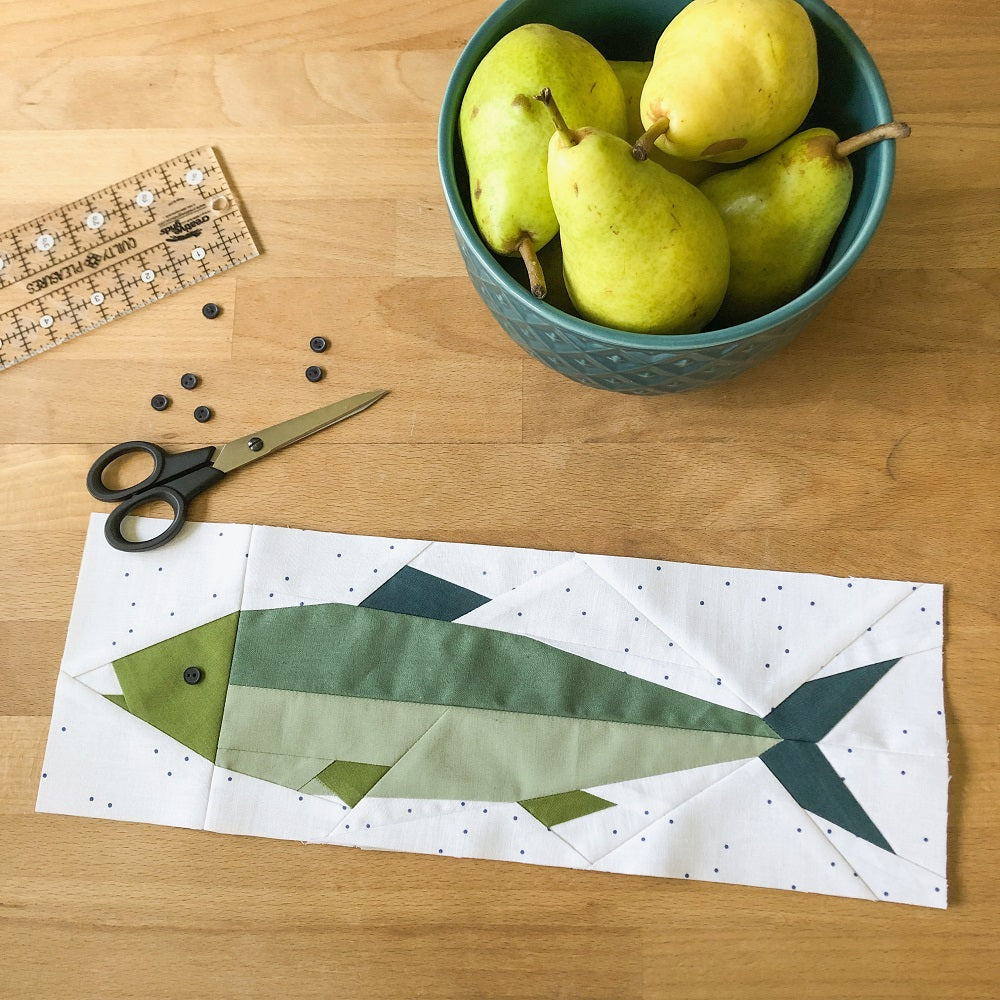 Ready for a bunch of happy Sardines? This quilted wall hanging makes a great statement in the home of any fish enthusiast! And it is such a fun project: five foundation paper pieced fish blocks, finished off with a tiny button eye as fun and whimsical detail.